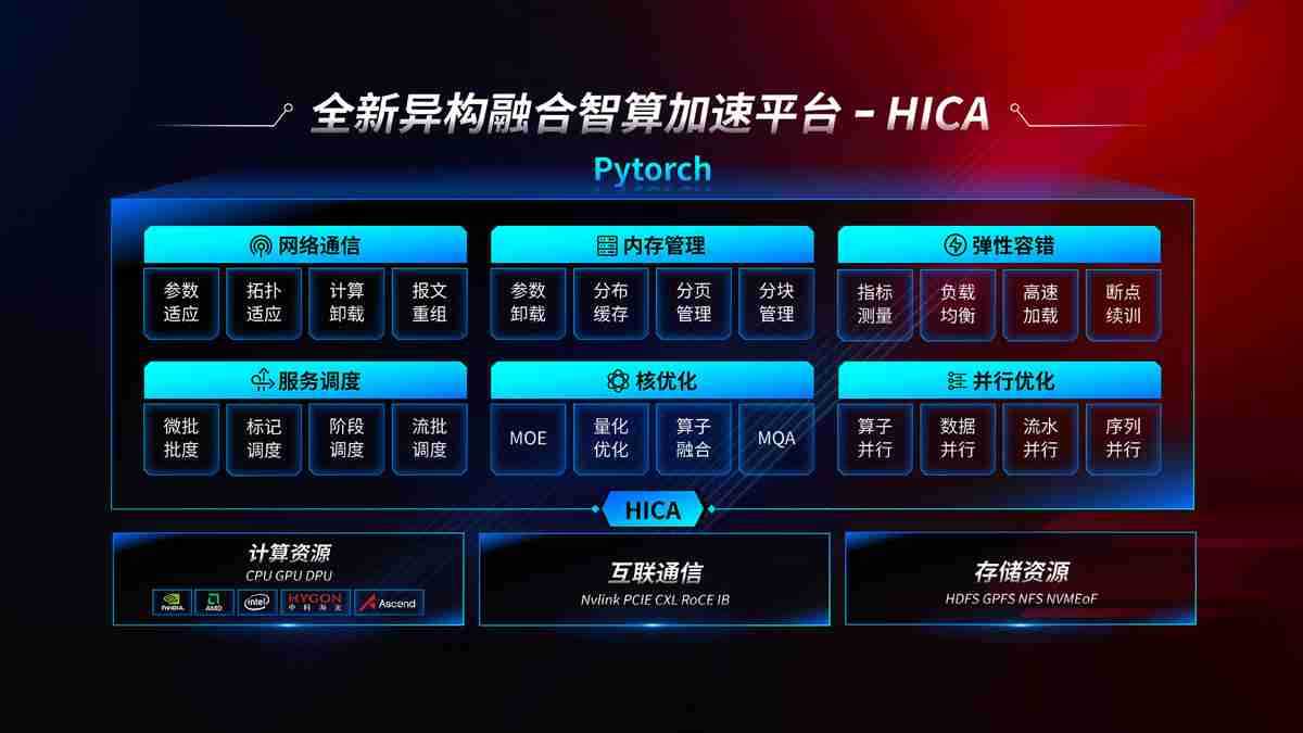 通过自研的服务层、、、、中间适配层、、、、以及调度编排算法,,采用数据并行、、模型并行等多种并行方式,,,把并行计算任务进行有效的分解,,,使其分别由相应的软件栈和算力资源来承接。。。。当GPU资源变化,,,,HICA可以实时动态调度计算子任务并调整模型拓扑和架构,,,以充分聚合各种算力资源。。。。